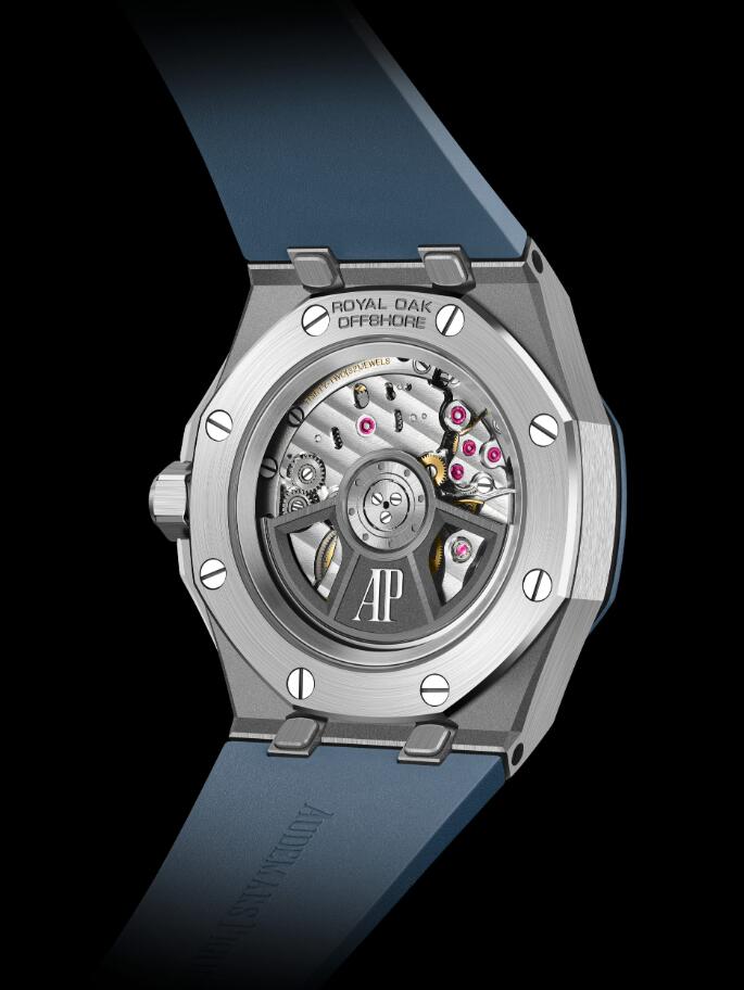 Das bis 100 Meter wasserdichte 43-mm-Edelstahlgehäuse ist mit einer blauen gummibeschichteten Lünette ausgestattet und an einem passenden Kautschukarmband befestigt. Diese zweifarbige Ästhetik setzt sich auf dem rauchblauen Méga Tapisserie-Zifferblatt fort. Das Zifferblatt ist mit rhodinierten goldfarbenen, trapezförmigen Stundenmarkierungen und Royal Oak-Zeigern ausgestattet, die für optimale Sichtbarkeit mit einer Lumineszenzbeschichtung versehen wurden, einer blauen Innenlünette und einem AP-Monogramm aus poliertem rhodiniertem Gold bei 12 Uhr. Außerdem gibt es ein Datumsfenster bei 3 Uhr. Weitere erwähnenswerte Details sind der neu gestaltete Kronenschutz und die satinierten Nieten, die das austauschbare Armbandsystem bedienen.